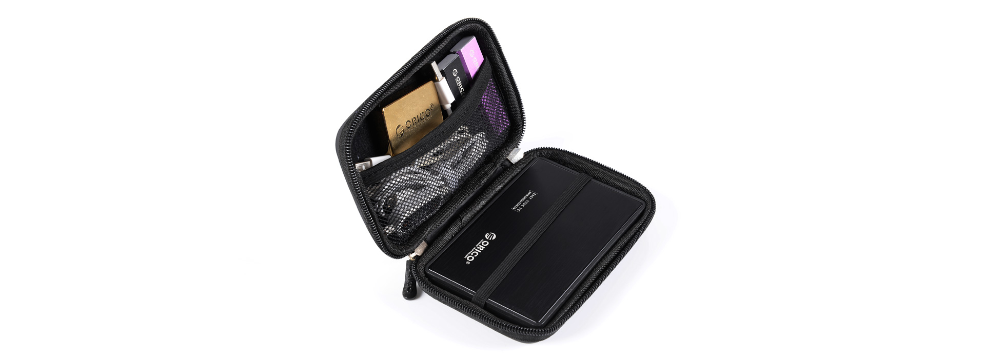 收納包內部設計非常合理,大空間主體可收納2.5寸硬盤,并設計彈性好的護帶,保護硬盤不晃動、不滑落,在蓋面上也增加了網面隔層設計,可收納與硬盤搭配的數據線,或者耳機、U盤等,對空間進行了利用,做到小身材大容量。