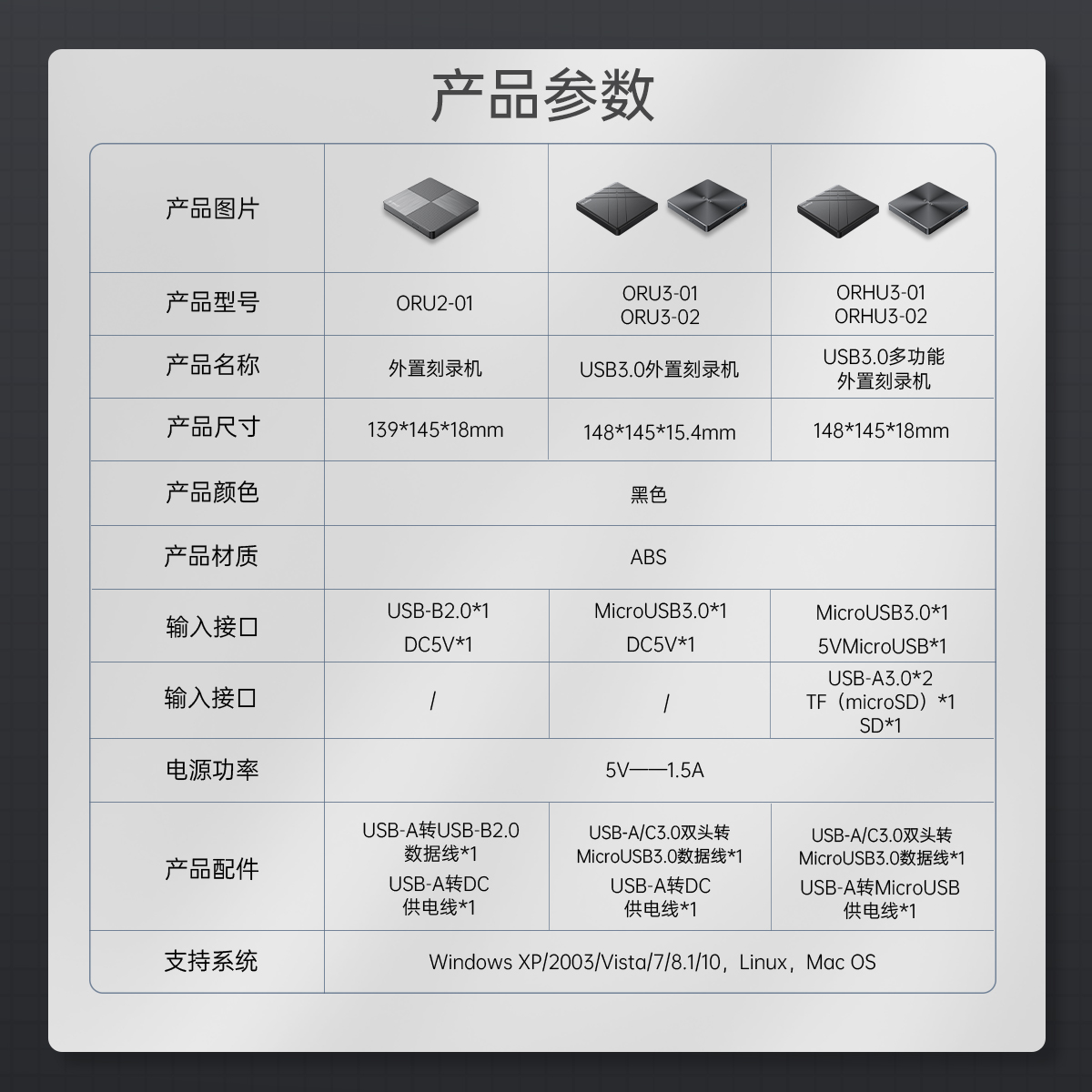 ORU2:USB-A轉USB-B2.0數據線*1 USB-A轉DC供電線*1 ORU3:USB-A/C3.0雙頭轉MicroUSB3.0數據線*1 USB-A轉DC供電線*1 ORHU3:USB-A/C3.0雙頭轉MicroUSB3.0數據線*1 USB-A轉microUSB供電線*1