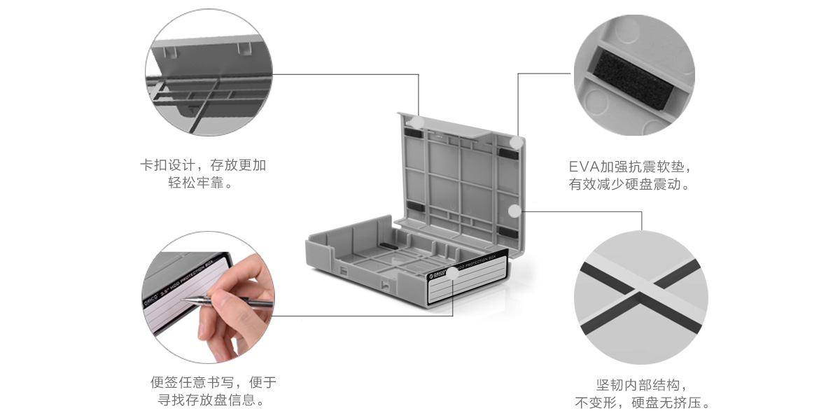 健康、無毒是現代人對日常用品的一項基本要求,為了迎合當今的環保理念,我們采用了無論是物理性能還是熱性能、電性能都很好的PP料,在日韓等國家PP材料被廣泛用于微波餐具等產品,ORICO采用PP材料制作的硬盤收納盒,嚴絲合縫,確保您的硬盤存放多年依舊如新,不受水汽、靜電、塵埃的侵擾。