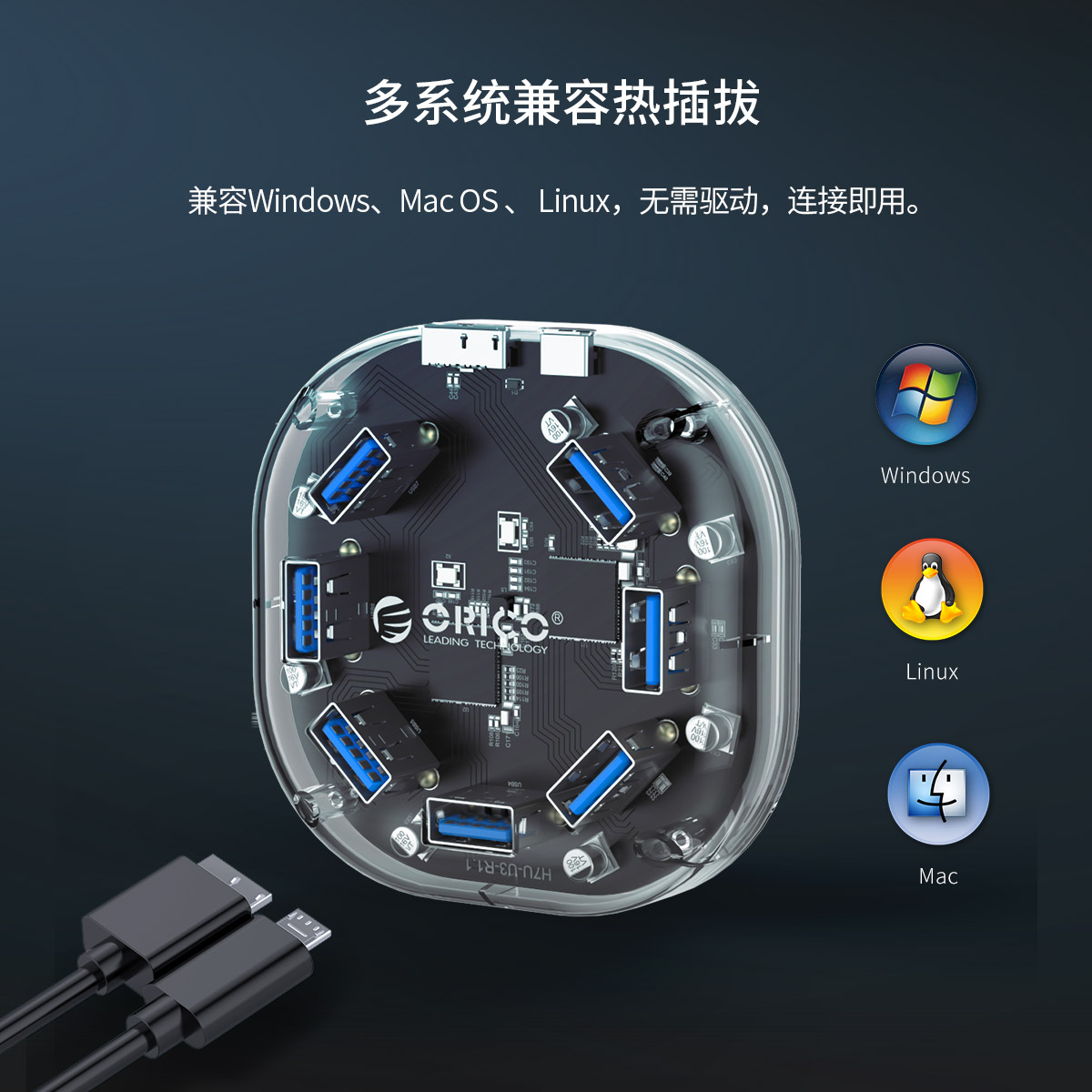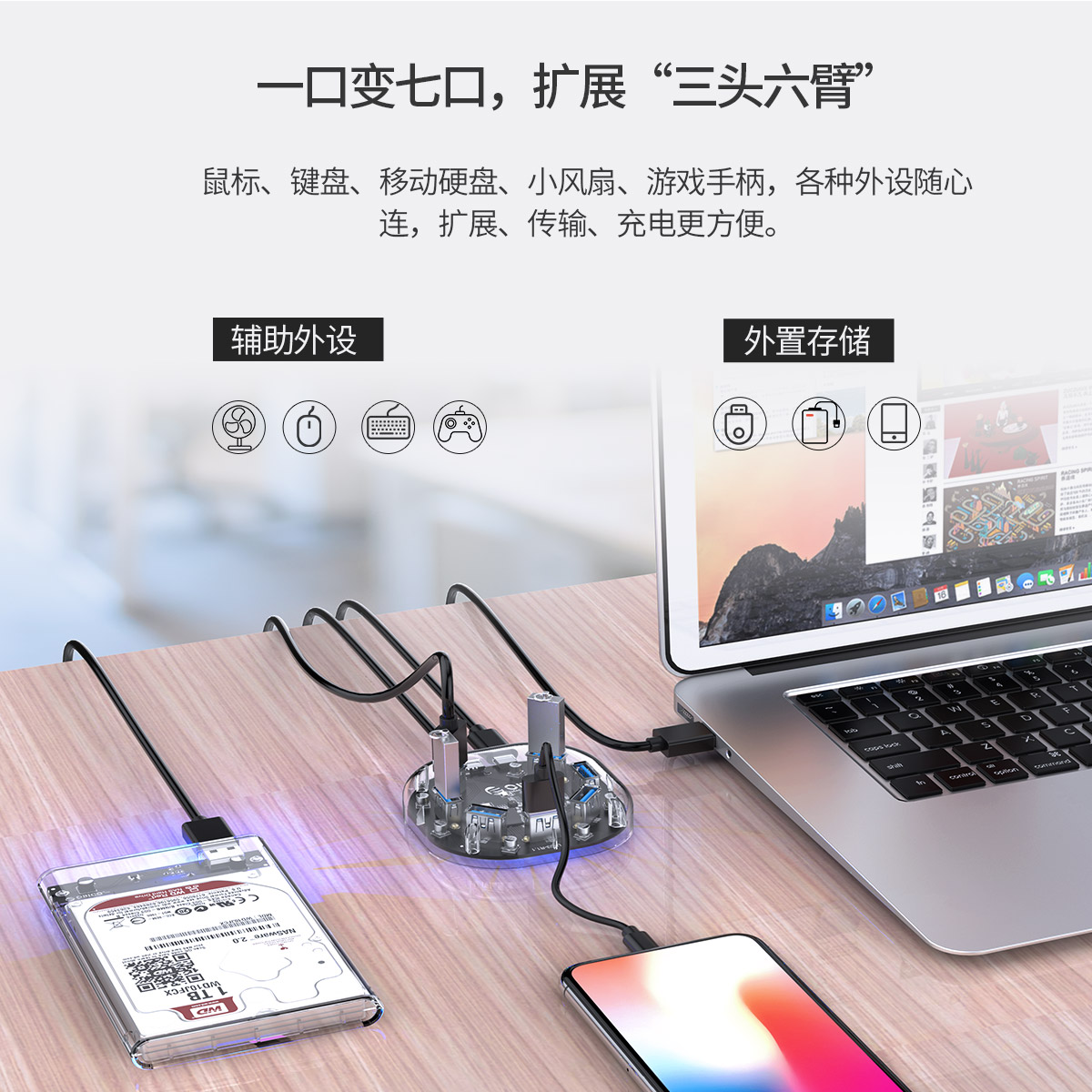 7口USB3.0透明桌面集線器,支持OTG拓展