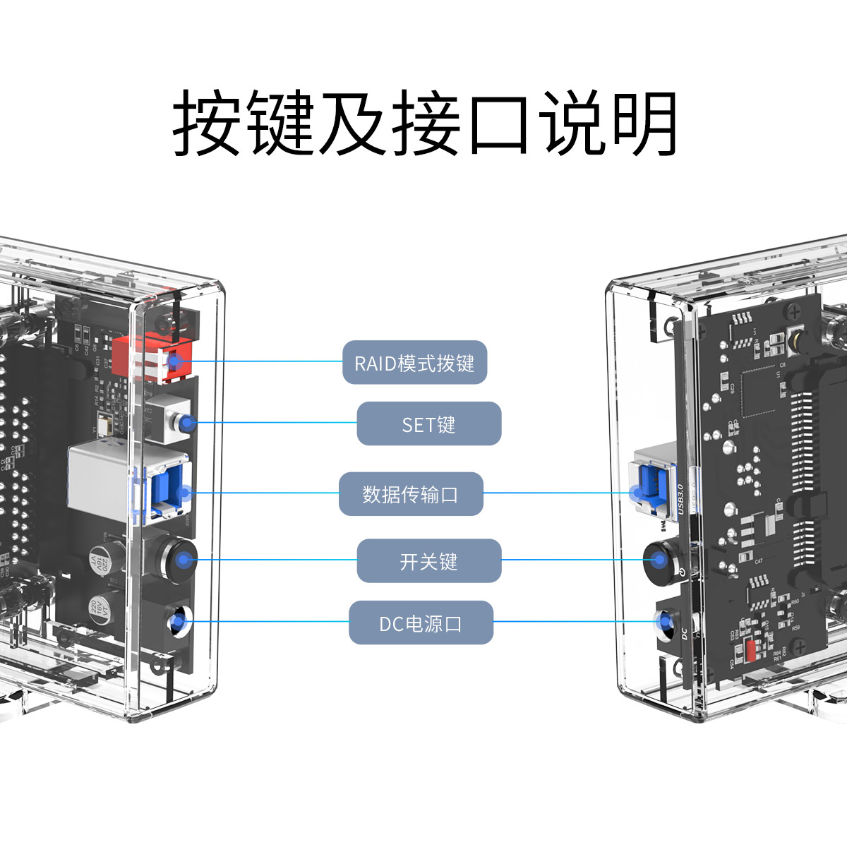 奧睿科透明家族雙盤位硬盤盒按鍵及接口說明