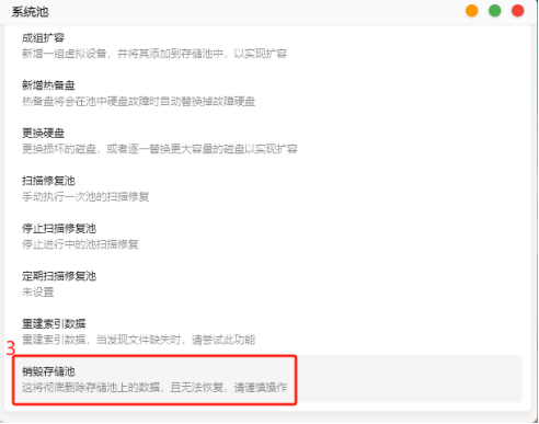 往下滑動找到“銷毀存儲池”,點(diǎn)擊后輸入管理員密碼,即可完成存儲池的銷毀。