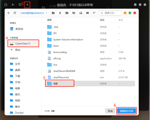 點(diǎn)擊左上角的“+”,再選擇外部存儲(chǔ)設(shè)備的影視文件夾后,點(diǎn)擊“選取選中文件”。
