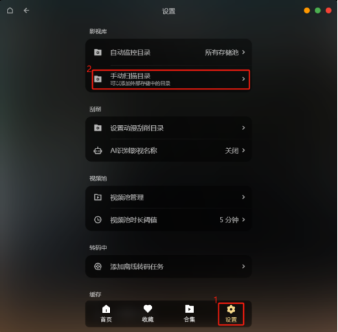 點(diǎn)擊影視應(yīng)用的底下的“設(shè)置”,再點(diǎn)擊“手動(dòng)掃描目錄”進(jìn)到手動(dòng)掃描目錄管理。